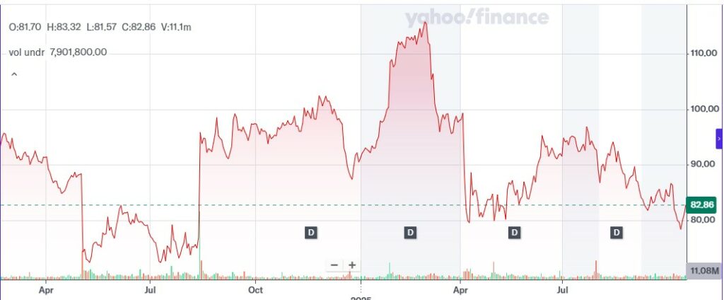 Starbucks share price evolution since Q1 2024. Source: Yahoo Finance.